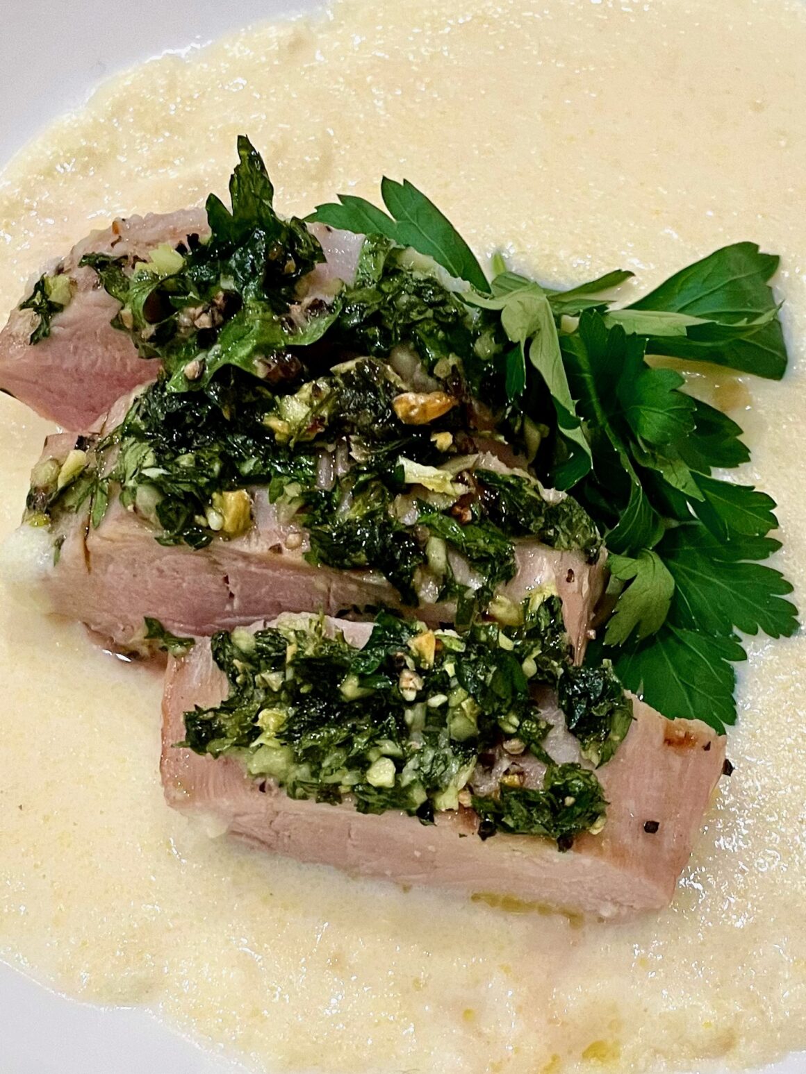 The shelves of the grocery store were reminiscent of the pandemic today, as most of the country prepares for a massive storm. Many will spend the next few days at home, and apparently everyone plans on cooking. These are soup or crock pot meal kind-of days, but I think this dish hits the same comfort-food mark. Pork Loin with Polenta For the Pork 4 large garlic cloves 1 cup of parsley, packed 2 tablespoons olive oil 3 tablespoons white balsamic vinegar 1/2 stick unsalted butter, softened Kosher salt Ground pepper In a food processor, place the garlic, parsley, oil, and vinegar and process to a fine chop. Set aside. Coat…